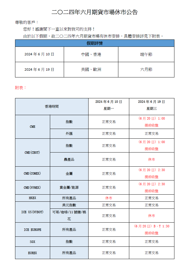 【期貨】二〇二四年六月期貨市場休市公告