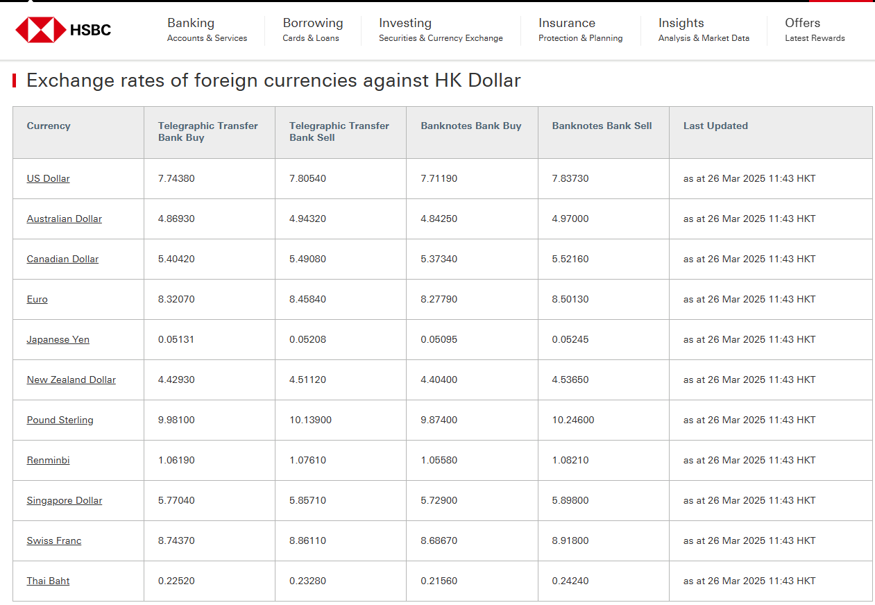 2025年3月26日本週換匯匯率