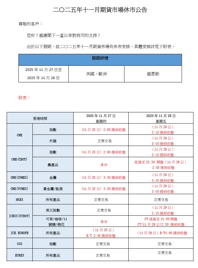【期貨】二〇二五年十一月期貨市場休市公告