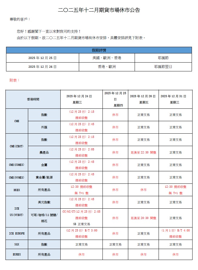 【期貨】二〇二五年十二月期貨市場休市公告