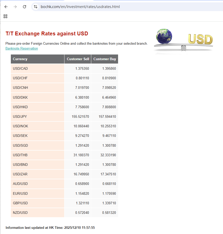 2025年12月10日本週換匯匯率
